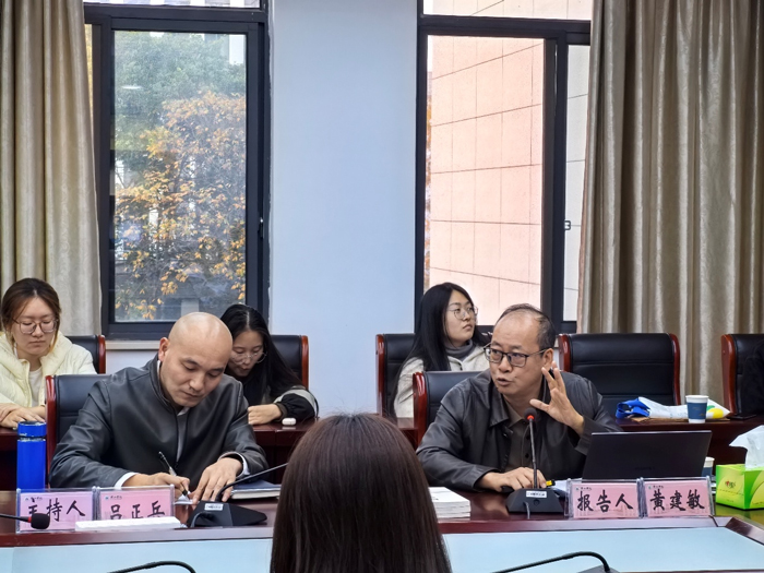 讲座伊始,现场播放专题片《非遗真年轻》,黄建敏结合影片从传承与创新视角解读徽州文化传媒产业内涵及现状。他指出,发展该产业兼具多重意义,既响应国家号召,满足百姓文化需求,又能激活徽州丰富的非遗与古建资源,契合市场消费热潮与媒体发展机遇。