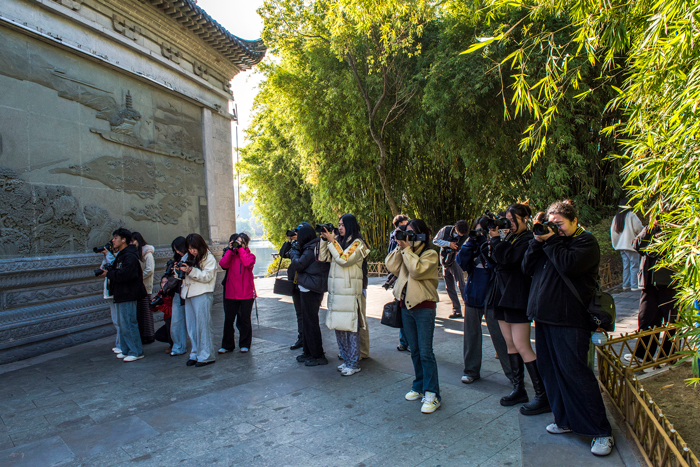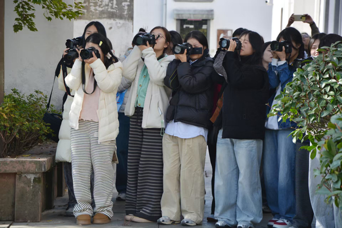 上午10时30分,实践队伍转场至屯溪湖边古村落。在徽派浮雕照壁与白墙黛瓦之间,指导教师现场示范,就拍摄参数、取景角度、光影运用及前景背景搭配等进行针对性讲解,推动摄影理论向实操能力转化。在屯浦归帆广场,教师还演示了无人机拍摄技术,并运用设备为全班拍摄了一张特殊的“空中全家福”。