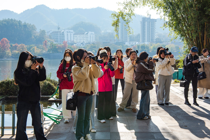 早晨7时50分,学生在率水校区文渊楼前集合出发。首站抵达黄山百佳摄影点——螺蛳顶。师生登顶拍摄,以镜头俯瞰新安江畔中心城区的发展新貌,并在行进中抓取山野间的自然景观与人文瞬间,在实践中检验课堂所学。