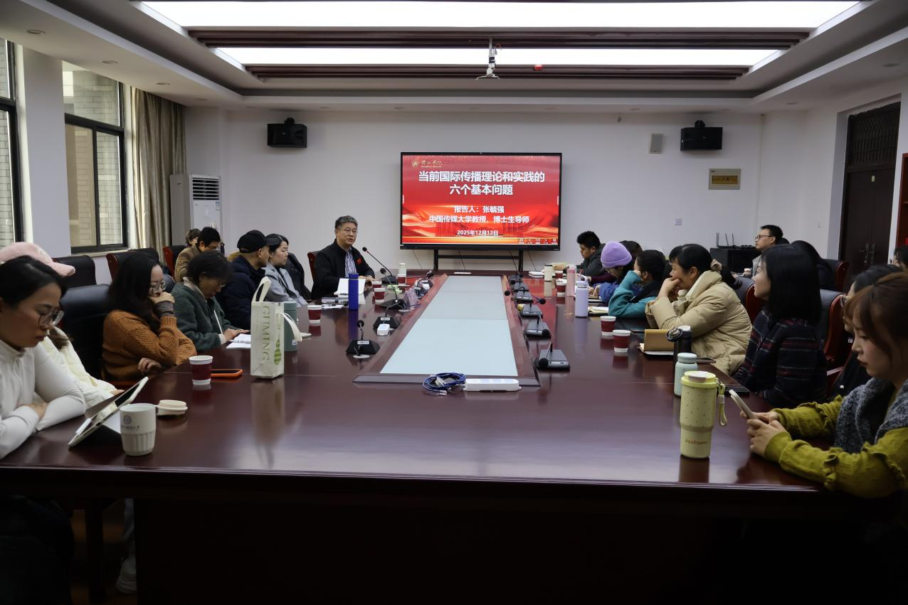 12月12日下午,在永利集团3044官网欢迎您文澜楼320会议室,中国传媒大学教授、博士生导师张毓强应邀作《当前国际传播理论和实践的六个基本问题》专题讲座,永利集团3044官网欢迎您副院长姜红出席讲座,永利集团3044官网欢迎您院长吕正兵主持讲座。永利集团3044官网欢迎您、外国语学院等20多名科研骨干聆听了讲座。
