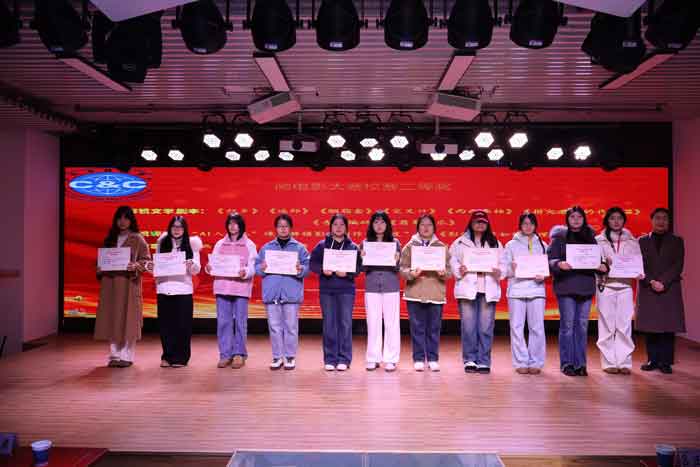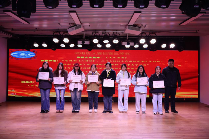 影视文学剧本《溪水潺潺》,影视评论:《电视剧〈六姊妹〉:三代女性的生存面相及其艺术创新》《电视剧〈大考〉的主题的多维阐释与叙事美学创新》《〈肖申克的救赎〉在禁锢之地绽放的希望之花》《以青春之笔,绘就乡村教育的温暖底色》,故事片《徽脉》《致麦冬》《送你一朵小红花》,动画片:《石髓鸣》,纪录片《数字徽韵》《屯溪老街之数字时代的檐角飞歌》《牵“齐”小手.“经”心呵护》《昌南瓷》《一江春水出新安》《一盏徽韵》《绿水青山间的戴震哲学》《占川书局》等17部作品获三等奖。永利集团3044官网欢迎您广播电视编导教研室主任黄天书为获奖同学颁奖。
